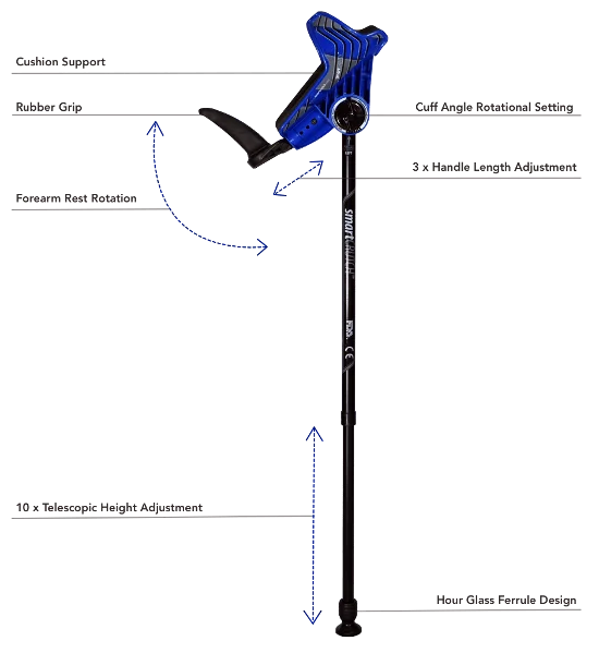 SmartCrutch biedt optimale steun en maximaal comfort en is geschikt voor een lichaamslengte tussen 1,52 en 1,95 cm. en een max. gebruikersgewicht van 120 kg.